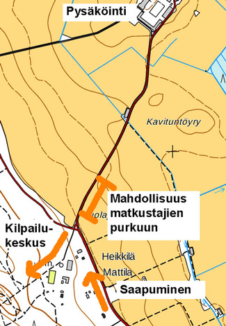 Matkustajat voivat nousta autosta kilpailukeskuksen läheisyydessä (500 m ) ja kuljettaja siirtää auton pysäköintiin n. 900 m. Matkaa pysäköinnistä kilpailukeskukseen n. 1400 m. Poistuttaessa voi kuljettaja hakea auton ja lastata valmiina olevat matkustajat vastaavasti purkupaikalta kyytiin.