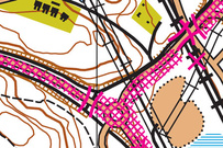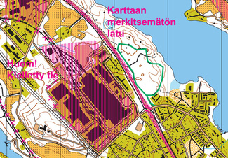 Lisäohje karttamerkinnöistä:Karttaan on merkitty ”ristikkorasterilla” kielletyiksi alueiksi vilkkaimmat tiet. Ko. teiden reunassa olevien pyöräteiden käyttö on sallittu. Rasterikuviota ovat korostettu niin, että tien kielletty laita on kuvattu leveämmällä rasterilla. Tien saa ylittää/alittaa käyttäen karttaan ylityspaikoiksi merkittyjä tunneleita ja siltoja. |
