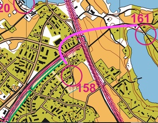 Muutamat osallistujat olivat ylittäneet Hattulantien kuvan osoittamasta paikasta. Kyseisessä kohdassa on suojatie, joten liikennesääntöjä ei tässä tapauksessa rikottu. Järjestäjät olivat kuitenkin linjanneet turvallisuussyistä, että kolme vilkkainta tietä (+rautatie) on luvallista ylittää tai alittaa vain järjestäjän ilmoittamista kohdista. Sallituissa kohdissa oli aina joko silta tai tunneli. Turvallisuuden lisäksi nämä ”kielletyt tiet” palvelivat hyvin myös ratasuunnittelua. Muutoin ehkä liiankin suoraviivaista juoksemista tarjoavaan maastoon sai kiellettyjen alueiden avulla mielekkäämmän suunnittelutehtävän. Ratamestari voi tietysti mennä myös siinä mielessä itteensä, että ketään ei saisi houkutella rikkomaan ohjeita. Mutta kuten internetissäkin, kaikki mikä vaikuttaa liian hyvältä on huijausta. 110 pistettä viidessä minuutissa on Kaupunkirogainingissa liian hyvää ollakseen totta. Ratamestari puolustautuu sillä, että suunnittelemalla toisella tavalla reitin, molemmat rastit (siis 158 ja 161) olisi ollut napattavissa järkevällä tavalla. Alla yksi vaihtoehto (kuva 2).