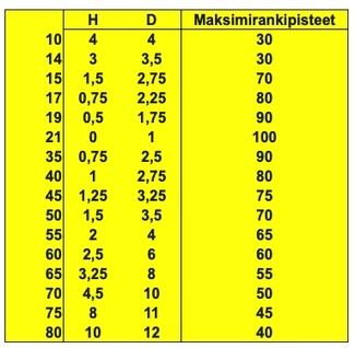 Tässä logiikka, jolla osallistujat laitetaan jonoon ennen starttia:Sarjatasoitus:- laskettu vuosituhannen alussa kestävyysjuoksun ennätyksistä sekä suunnistuksen SM-kisojen tuloksien perusteella. Ideana kuinka monta min/km ko sarjan parhaat jäävät H21 sarjan kärjelle. Esim H40 sarjan kärki jää 1 min/km H21 kärjelle. D40 sarjan kärki jää 2,75 min/km H21 sarjan kärjelle. Tasotasoitus:- lineaarisesti rankipisteiden suhteessa sarjan maksimirankipisteisiin. 0-pisteillä saa tasoitusta 4 min/km. Sarjan max pisteillä 0 min/km - esim: 60 sarjassa saanut 40 rankipistettä. Tasotasoitus on (20/60 * 4 min/km) = 1,33 min/km Poikkeukset:- Jos ei ole rankipisteitä, tulkitaan että rankipisteitä on 1/3 sarjan maksimipisteistä. - Jos on rankinoteraaus useammasta sarjasta, huomioidaan parhaimmat pisteet ja "sarja" pisteiden mukaan (pelattu syntymävuodella kohdalleen) Kun matkaa on maili, niin min/km arvot kerrotaan 1,6 km:lla Ja "voittaja" leimaa huiman loppukirin jälkeen ensimmäisenä maalissa! |